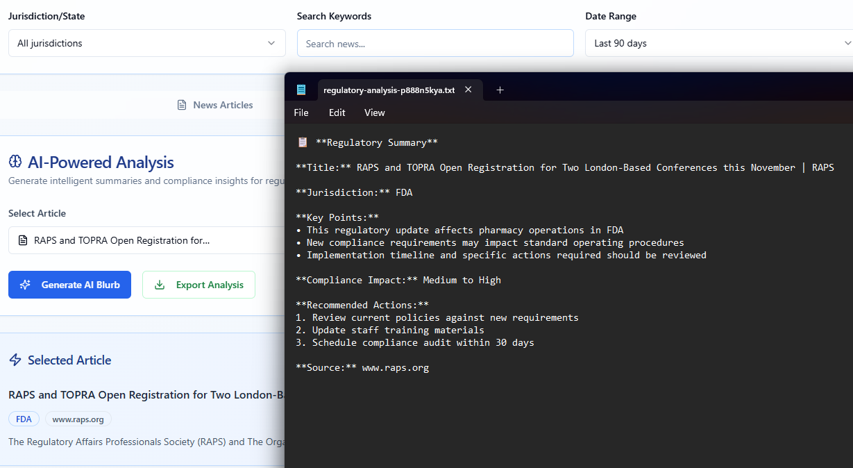 This isn’t theoretical. It’s how we built the Company Regulatory Compliance Intelligence Platform—a sophisticated application used in the pharmaceutical industry to monitor and interpret regulatory changes.